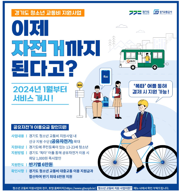 2024년 부터는 경기도 청소년 교통비 지원사업 내 신규 지원 수단(공유자전거)이 확대