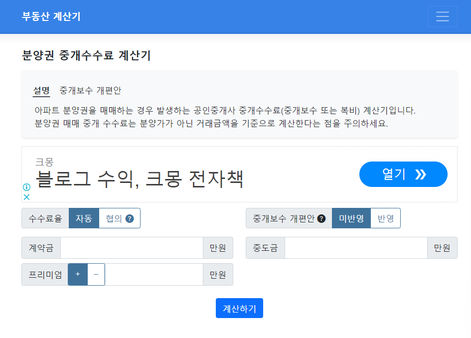 아래 계산기에서 분양가 (계약금 + 중도금)와 프리미엄 금액을 입력하시고 계산하시면 됩니다.