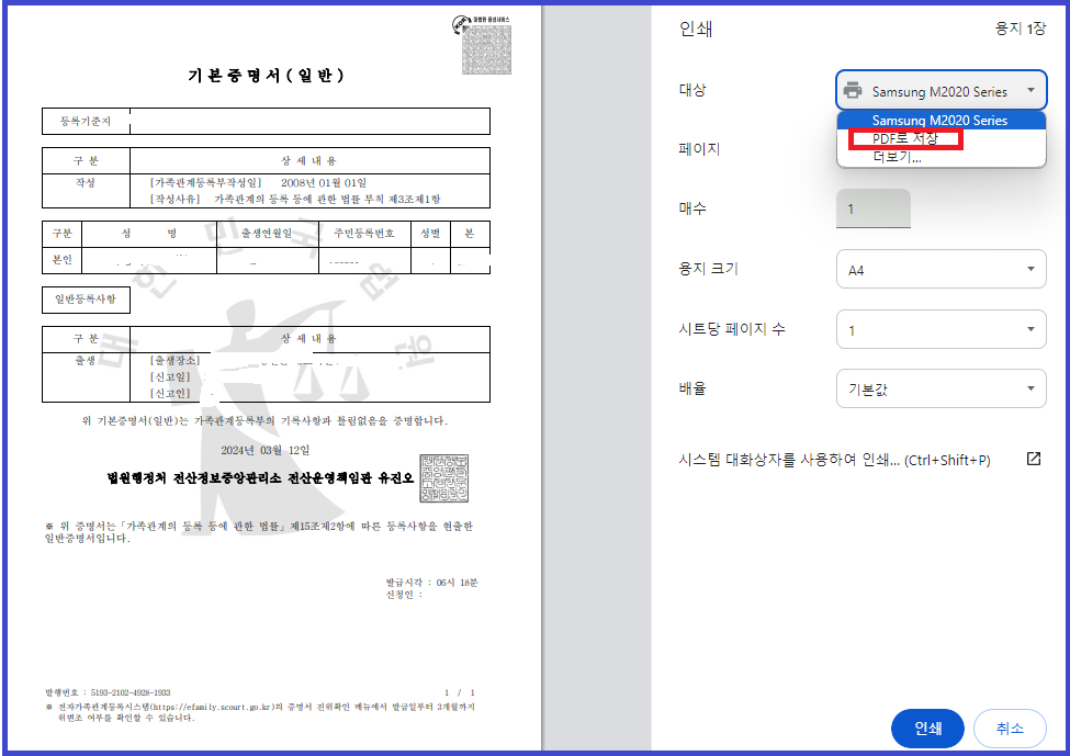 √ 기본증명서는 인쇄를 하셔도 되고, PDF 파일로 저장하셔도 됩니다.