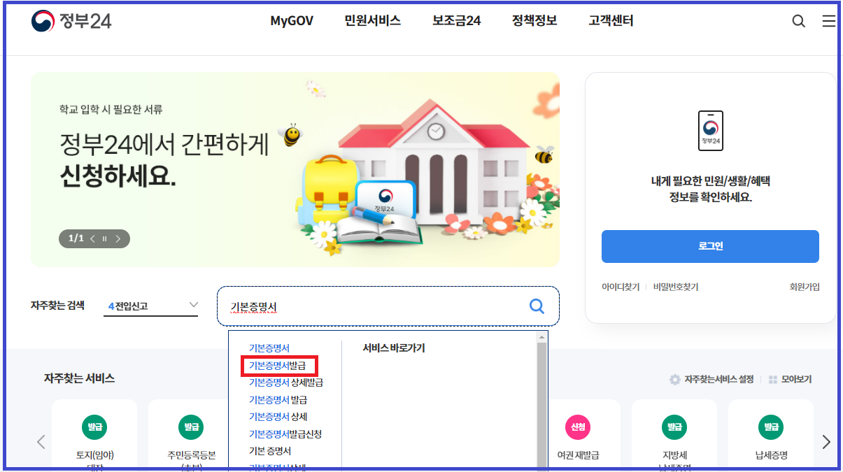√ 정부 24에 접속하신 후, 자주 찾는 검색에서 기본증명서를 검색합니다.