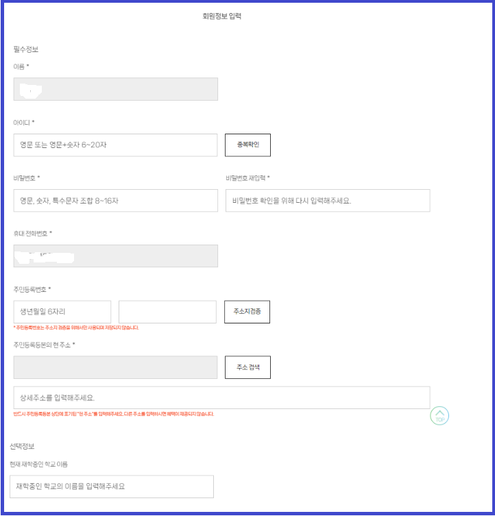 (단, 만 13세 이하 또는 휴대폰이 없는 청소년은 부모, 세대주 등 대리인이 회원가입 가능)