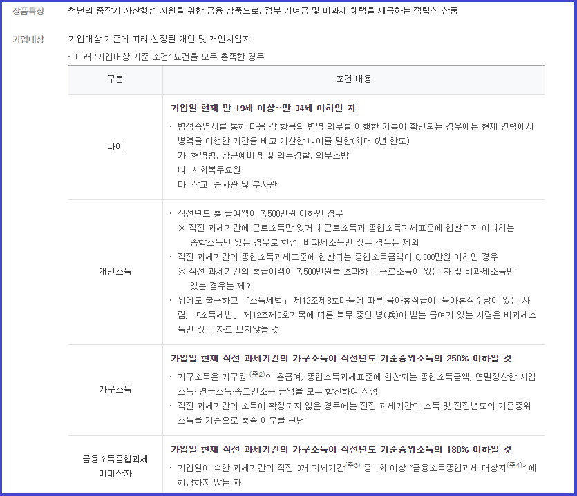 2. 가입대상 나이, 개인소득, 가구소득 기준은 아래와 같습니다.