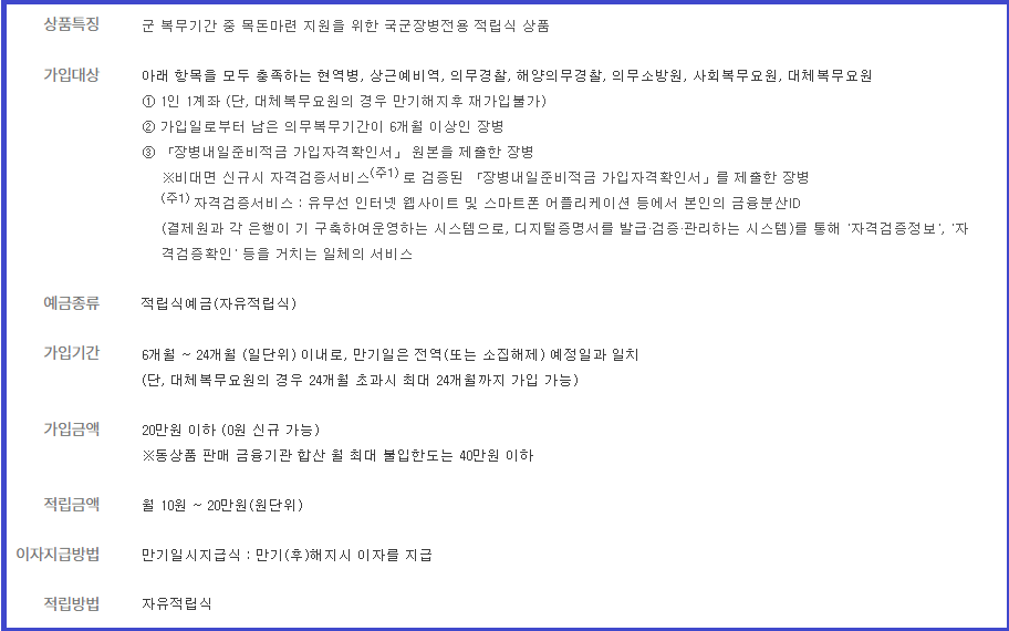 2. 가입대상은 군 복무 중인 직업군인으로 실명의 개인(1인 1 계좌)입니다.