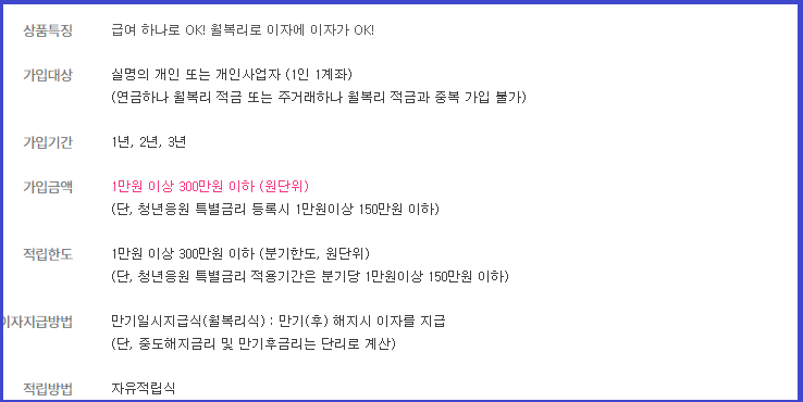 기간은 1년, 2년, 3년이고, 최대 가입한도는 300만 원이며,