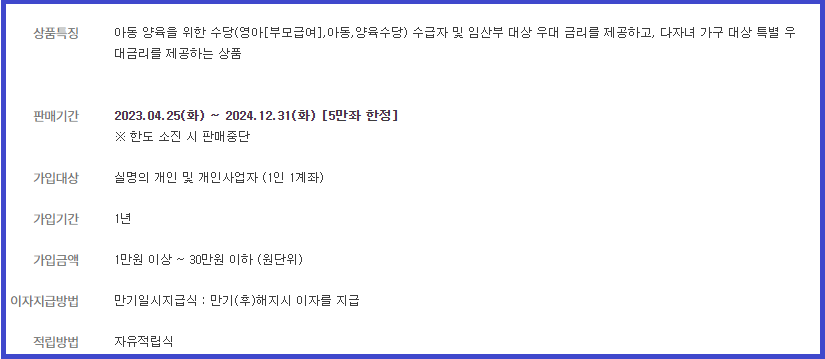 아동 양육을 위한 수당(영아[부모급여], 아동, 양육수당) 수급자 및 임산부 대상 우대 금리를 제공하고,