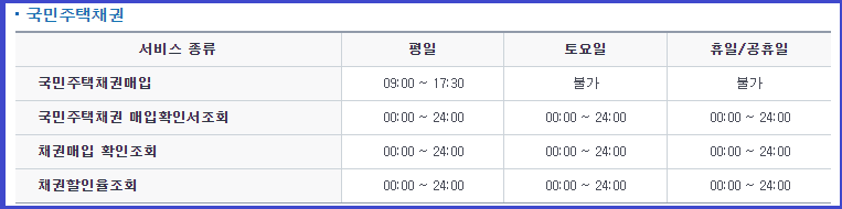 √ 국민주택채권매입 등 국민주택채권 서비스 이용시간은 다음과 같습니다.
