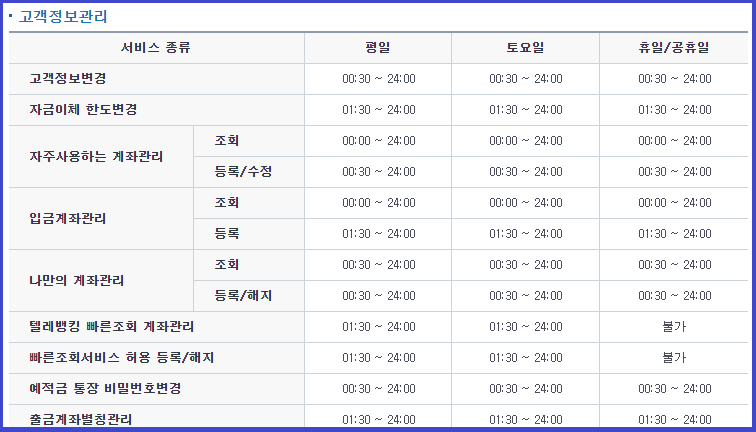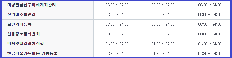 서비스별 이용시간은 당행의 사정(시스템/서비스 점검 등)에 따라 변경될 수 있습니다.