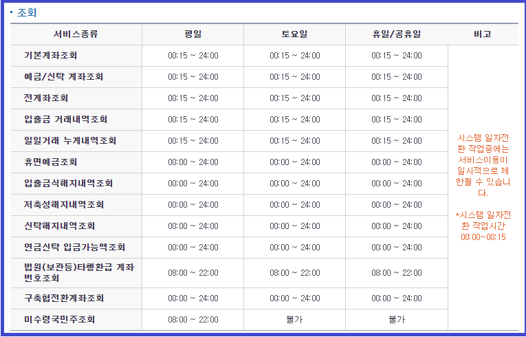 √ 기본계좌조회, 예금/신탁 계좌조회 등 일반적인 조회 시간은 다음과 같습니다.