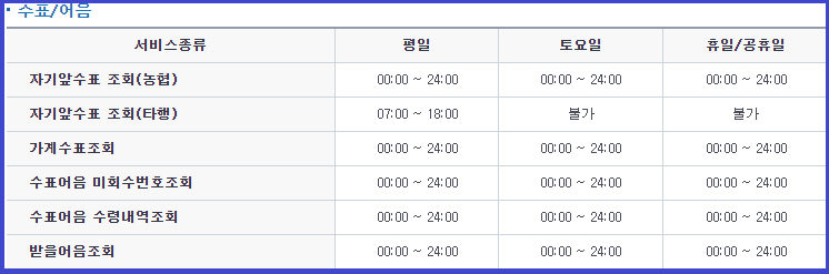 √ 자기 앞수표 조회 등 수표/어음 서비스 이용시간은 다음과 같습니다.