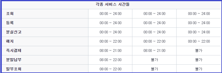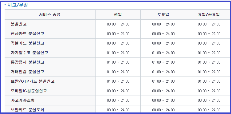 √ 분실신고 등 사고/분실 서비스시간은 다음과 같습니다.
