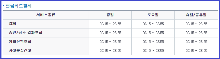 √ 현금카드결제 이용시간은 다음과 같습니다.
