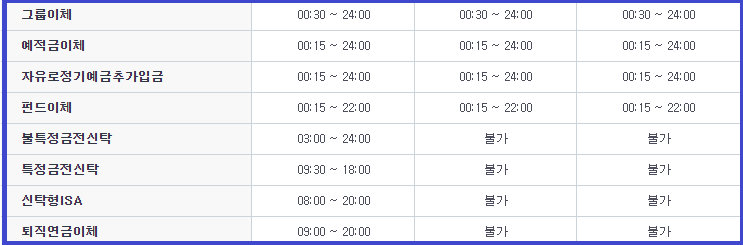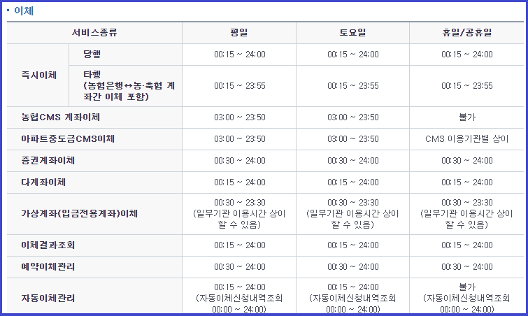 √ 즉시이체 등 이체서비스 가능시간은 다음과 같습니다.