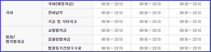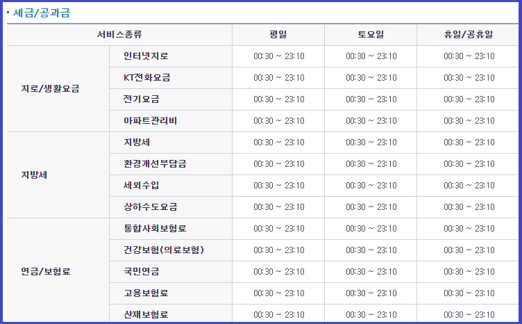 √ 지로/생활요금 등 세금/공과금 서비스 이용시간은 다음과 같습니다.
