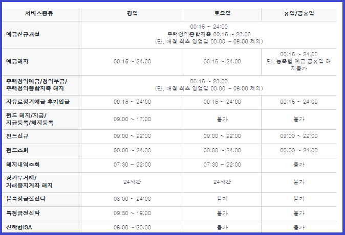 √ 예금 신규개설 등 예금/펀드/신탁 서비스 이용시간은 다음과 같습니다.