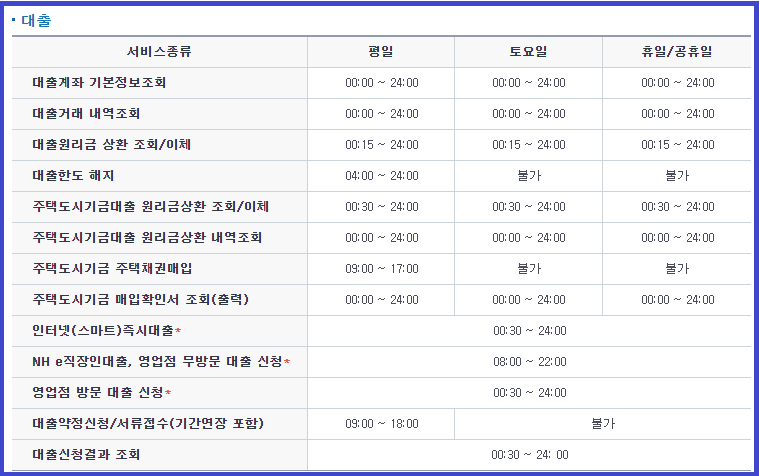 √ 대출계좌 기본정보조회 등 대출서비스 이용시간은 다음과 같습니다.