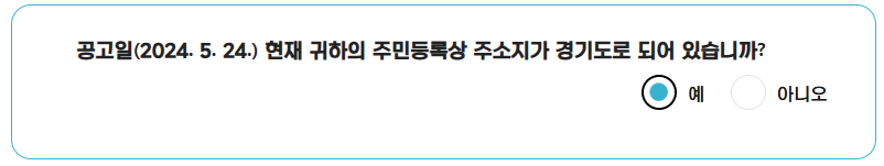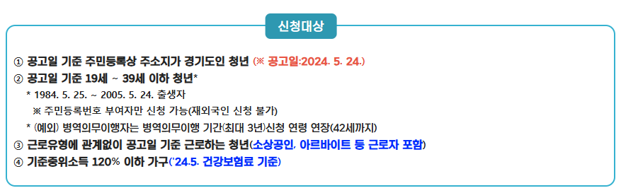 1. 공고일 기준 주민등록상 주소지가 경기도인 청년 (※ 공고일 : 2024. 5.24)