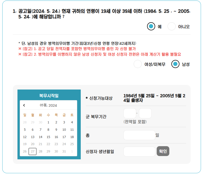 ☞ (예외) 병역의무이행자는 병역의무이행 기간 (최대 3년) 신청 연령 연장 (42세 까지)