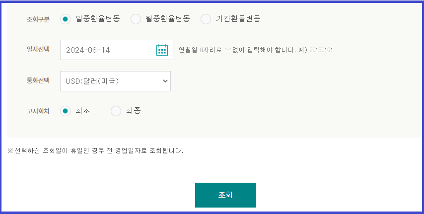 통화를 선택한 후, 일자를 선택하시고 조회하시면 됩니다.