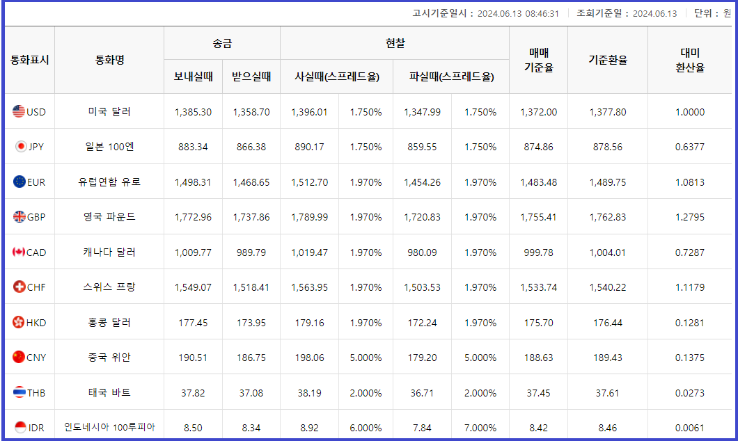 3. 조회기간 (2024.6.10 ~ 2024.6.13) 동안의 환율이 조회됩니다.