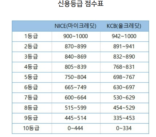 지금까지 개인 신용 등급별 비교, 개인 신용점수(NICE, KCB 점수표 및 평가표)에