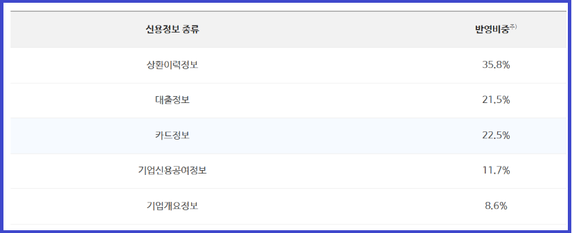 √ 상환이력정보 35.8% , 대출정보 21.5%, 카드정보 22.5%, 기업신용공여정보 11.7%,