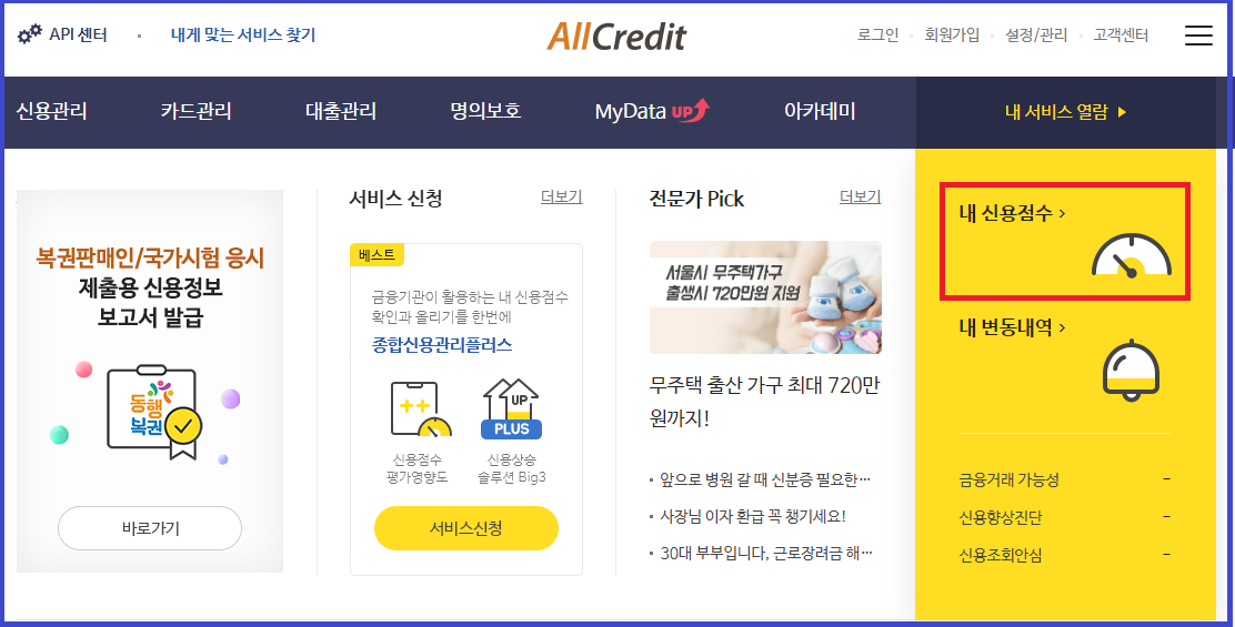 ㉱ 신용관리를 클릭해서 나의 신용점수 (KCB, NICE)를 확인합니다.