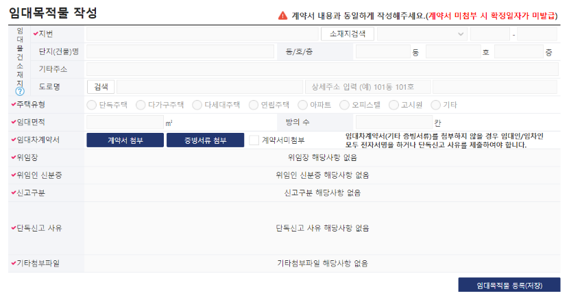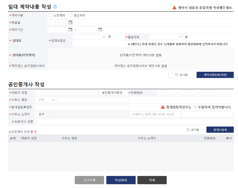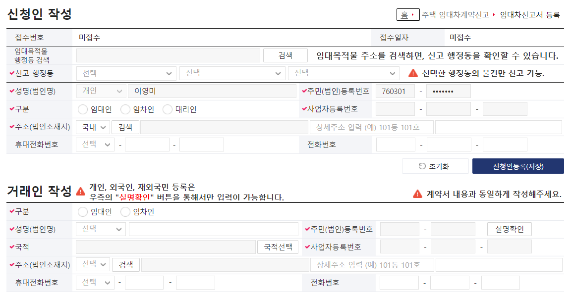 - 신청서를 작성합니다. (신청인 정보, 거래인 정보, 임대 목적물 정보, 임대 계약내용 등 입력)