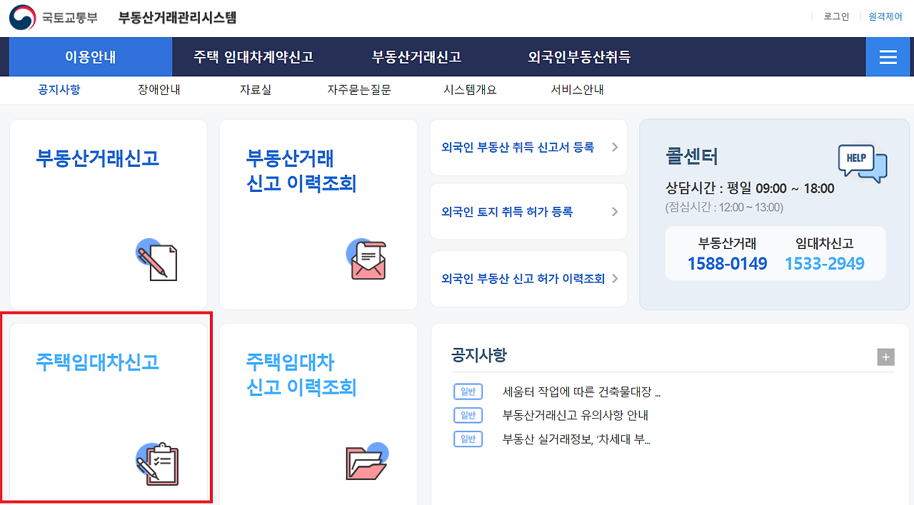 - '주택임대차신고' 메뉴를 클릭하고, 로그인을 합니다.
